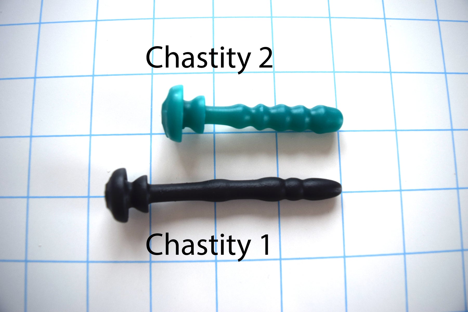 This short flexible silicone insert was created for use with a urethral chastity device or as a small contoured urethral plug. Our quality Platinum Cure Silicone makes this model a very comfortable, smooth, wearable appliance that can be configured with most male chastity cages (though specifically designed for the CB-6000 and CB-3000) or be worn alone as a short urethral plug, with or without an open core to accommodate voiding.