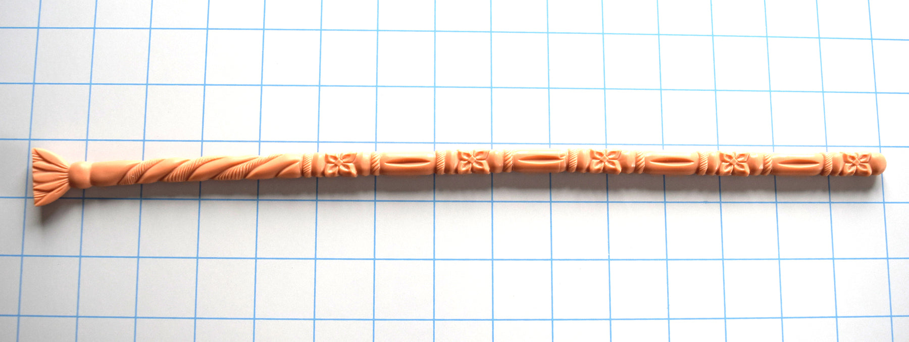 This is the longer version, at 14", of our most uniquely designed sound. It is the Florentine because of its Florettes, Balls, Ribs, and Twisted Rope surface geometries. It starts off with a rounded ball tip that is actually an elliptical type of ball that is wider in one direction than the other. The tip is immediately followed by a semi-rounded square Florette shape that is 9mm thick on two parallel sides and 10.5mm thick on the other two parallel sides. The next section is a long barrel-style surface with a long tapered indentation on two of the parallel sides and a smooth rounded surface on the opposite parallel sides. The piece repeats itself with two more florets and long barrels separated by two small ribs, one smooth and the other with several small surface ridges on the flatter parallel sides. The surface then transforms into a twisted rope-type design with the same small surface ridges on the alternating twists. The piece ends with a smooth retaining ball style structure just in front of a unique flat flared safety flange to ensure against over-insertion.