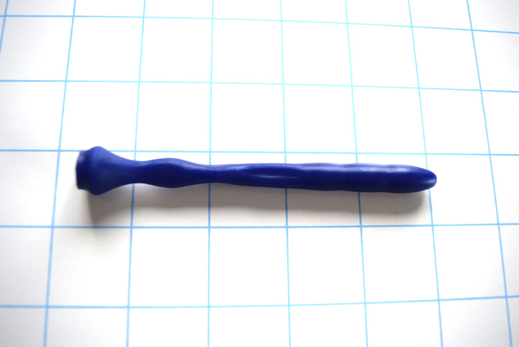 This 4.25” short flexible silicone insert was created after several customer requests for smaller stretching appliances to aide in urethral patency and expand urethral scar tissue resulting from multiple cystoscopy procedures. This sound begins with two small groves or valleys near the smooth tip, a dimpled section in and along the shaft, and a flattened billow section just before the flange. This urethral sound appliance would make a great introductory piece or a very comfortable wearable urethral incontinence plug. Unfortunately, due to the smaller diameter of near the flange, we do not offer an open bore selection on this model.