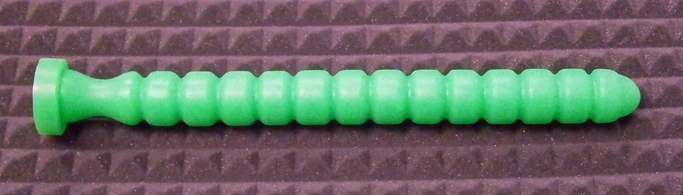The Caterpillar is a unique nozzle that can function not only as an Enema Nozzle but as a Retention style Colon Nozzle as well. Its twelve-barrel-style ribs can be inserted into any position and comfortably held in place with the small valley between each enlarged barrel-style rib. The multiple ribs and sensory valleys in this 16" overall length nozzle are 1.5" and 1.1", respectively, except for the final retention valley at the flange, being 0.9" in diameter. The safety flange is 2" in diameter. It is available with a 1/4" or 5/16" internal bore or as a solid piece without a bore.