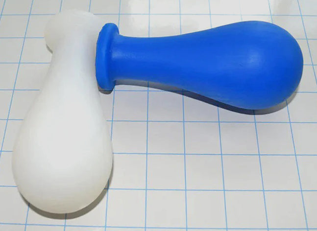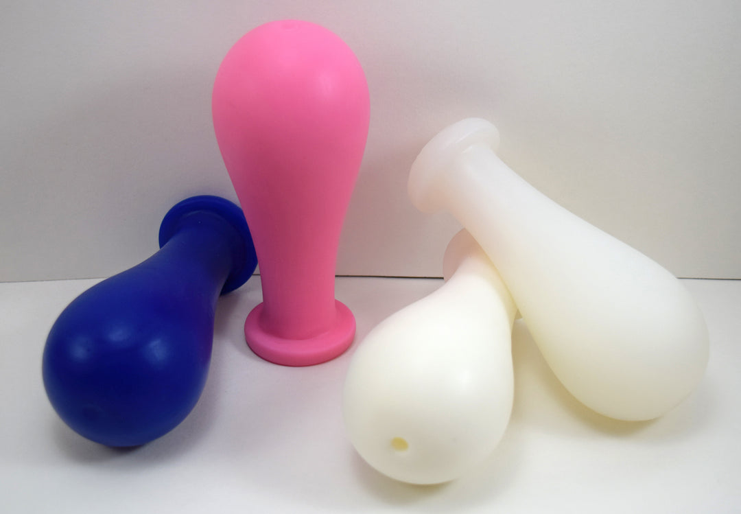 Here is a larger diameter retention style enema nozzle that has a smooth, tapered, oval-bulb shape that should have a very secure fit and seal, with enhanced fullness sensation in the rectum after insertion. The overall length of this enema nozzle is 5.5'' with a maximum diameter of 2.25'' at the center of the bulb expansion. It can be configured as a closed bore retention style plug or with an open configuration for the flow of the enema solution.