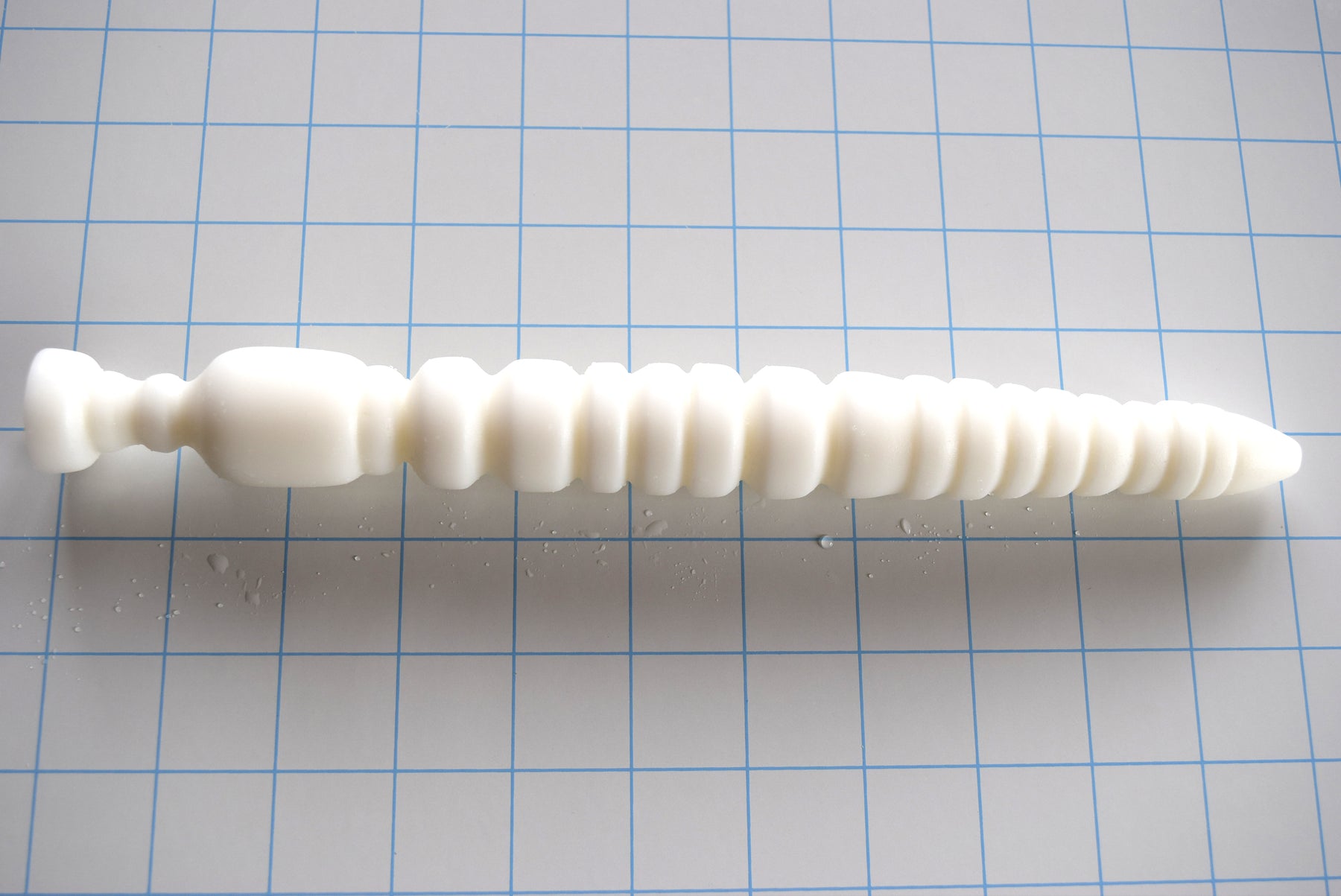 This slender diameter contains 18 multi-dimensional sensory ribs and valleys with a maximum 1.2" diameter at the barrel-style ball just in front of the flange. The tip is approximately 3/4" diameter, and the piece graduates in diameter with each rib up to the maximum 1.2" diameter. The overall length is 11" with 10.5" actually insertable. It is available with a 1/4" internal open bore or solid.