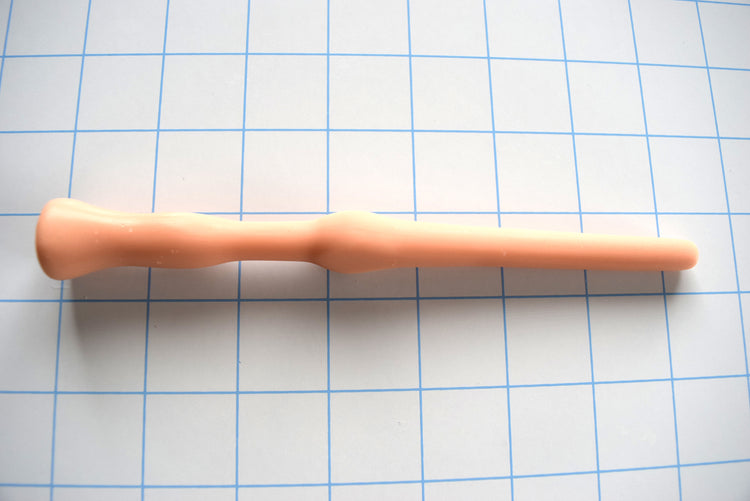 This piece has a 7”(180mm) total length with an approximate 6.6" 160mm insertable length.  The tip is 10mm in diameter, tapering up to 12.5mm, then it reaches a ball that is about 21mm long, that ball has been flattened on two ends, and if the two surfaces are measured, the flats measure 13mm, but the ball is 17.5mm in diameter on the rounded part. Then the retention valley begins; the valley is about 10.2mm in diameter, then it climbs up to 15.1mm before shrinking to a 14.2mm valley, which then climbs to the safety flange, which is approximately 21mm in diameter and is not intended for insertion.