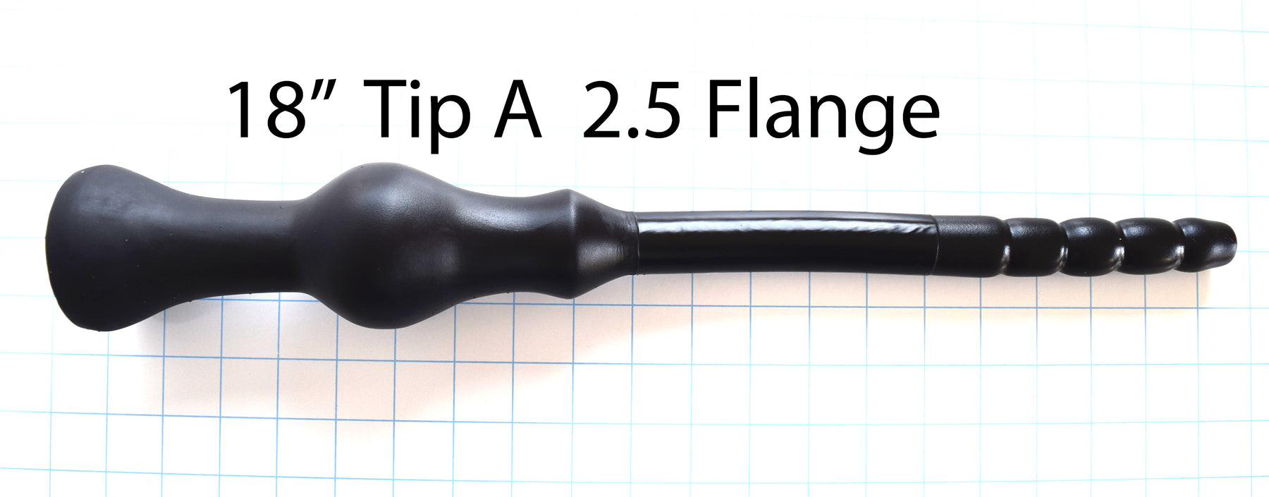 The photo of the Trans/White tube shows our latest upgrade to the CT-75 colon tube with the enhanced 2.5" tapered or sloped angle larger retaining style ball and short retention valley and safety flange. The black 2.5" round retention ball style has the longer retention valley and flange. The longer valley immediately following the ball is approximately 1.1'' to 1.2" in diameter and is about 2.5" long up to the hilt of the external safety flange.