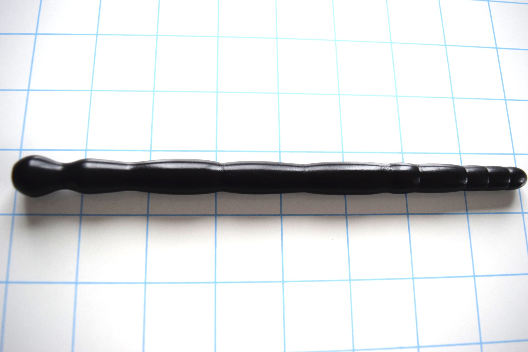 This piece is a moderate 7.5'' in length (allowing 7” for insertion), and has our desirable ball-shaped safety flange and unique hold-in-place retaining valley. The smooth rounded tip starts off at just 9.5mm (28.5 French) and is immediately followed by a 9mm (27Fr) groove or valley. The following four barrel-style segments or ribs taper up from approximately 9.8mm (29.5 French) to 11.7mm (35 French) in diameter, and respective accompanying valleys are 9.5mm (28.5 Fr) up to 10.5mm (31.5 Fr) in diameter. The next three barrel ribs are a little longer in length and further, taper up to a maximum 13mm (39Fr) diameter with accompanying valleys of 10.25mm (30.75 Fr). The final rib proximal to the base is 12.7mm (38.1 Fr), and the retaining valley is 9.3 mm (28Fr) just before the final safety ball flange.